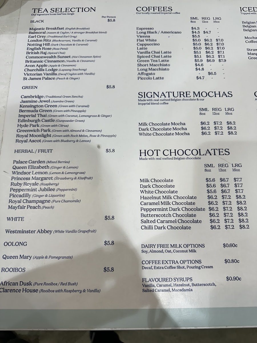 Coffees: A range of traditional and specialty espresso-based drinks is available, including Espresso, Long Black, Vienna, Flat White, Cappuccino, Latte, Vanilla and Spiced Chai Lattes, Green Tea Latte, Macchiatos (both short and long), Affogato, and Piccolo Latte. These options suit various tastes from strong and robust to milky and flavored coffee choices.